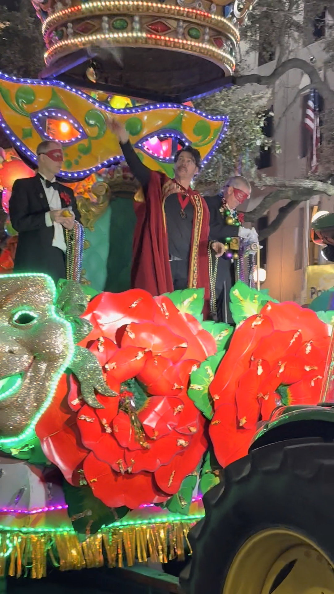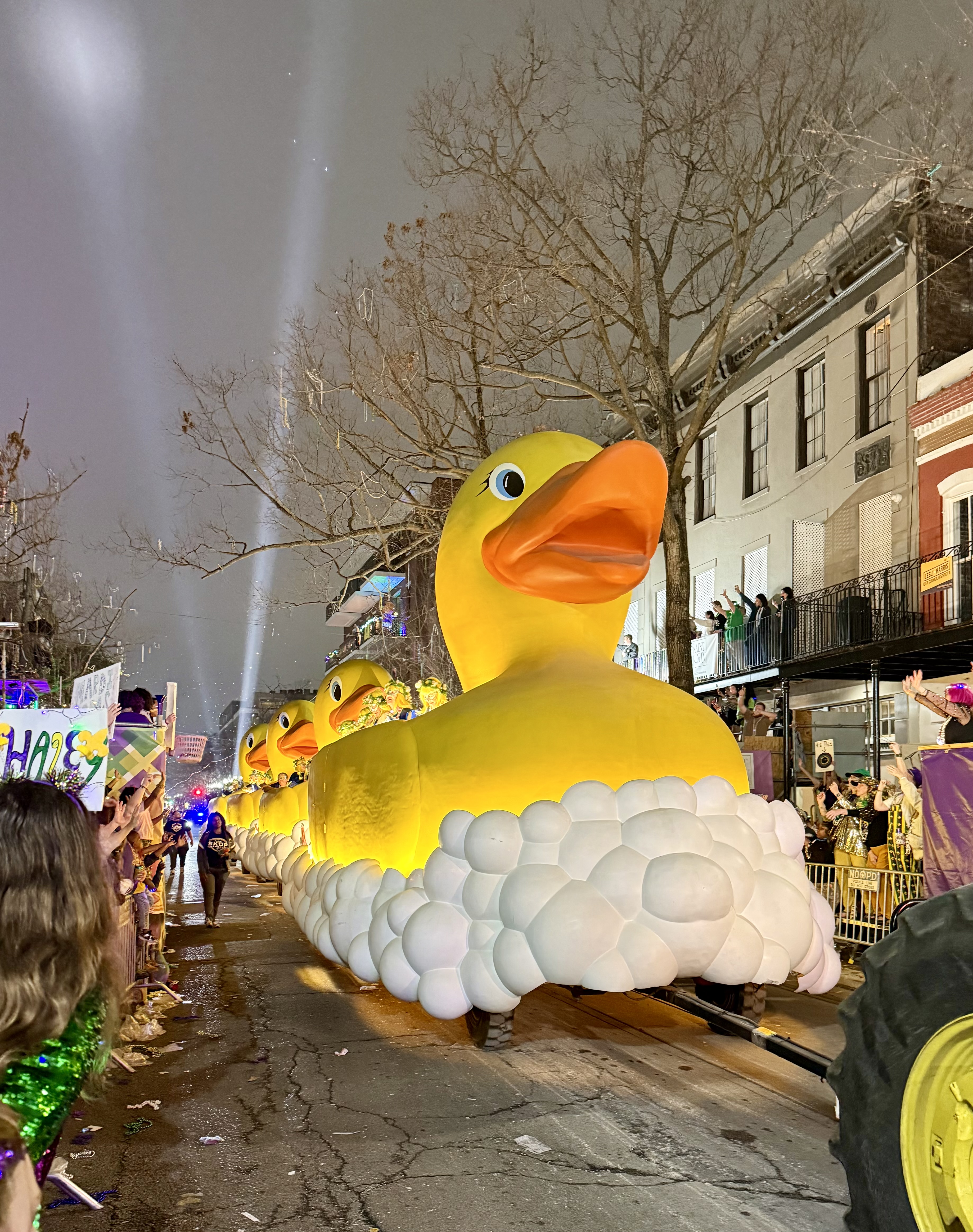 As the floats approached we were all on our feet arms in the air, waving instinctively for the treasured throw. There was so much to watch, everyone seeming to have a special way to catch the attention of the float riders. People were calling out special catch phrases, children on shoulders and ladders, adults in lighted hats, ladies in matching leopard outfits.