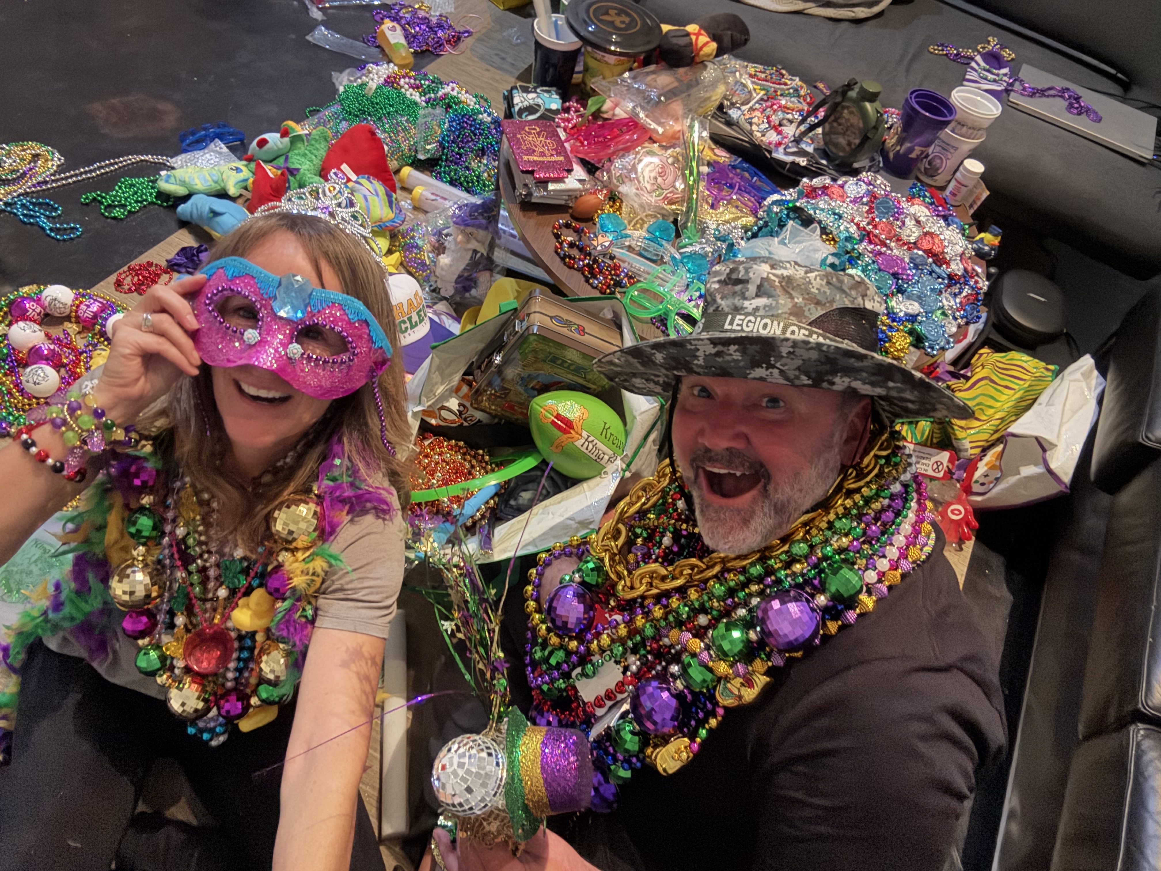 The joyful feeling of being part of Mardi Gras stayed with me throughout the 12 parades we watched. We met wonderful people at the parades, sharing the throws. We had much fun bringing a broom to reach the throws that were in the street beyond the barricade. Sweeping them out of the way before they were crushed. And sharing it with fellow parade goers to do the same.
